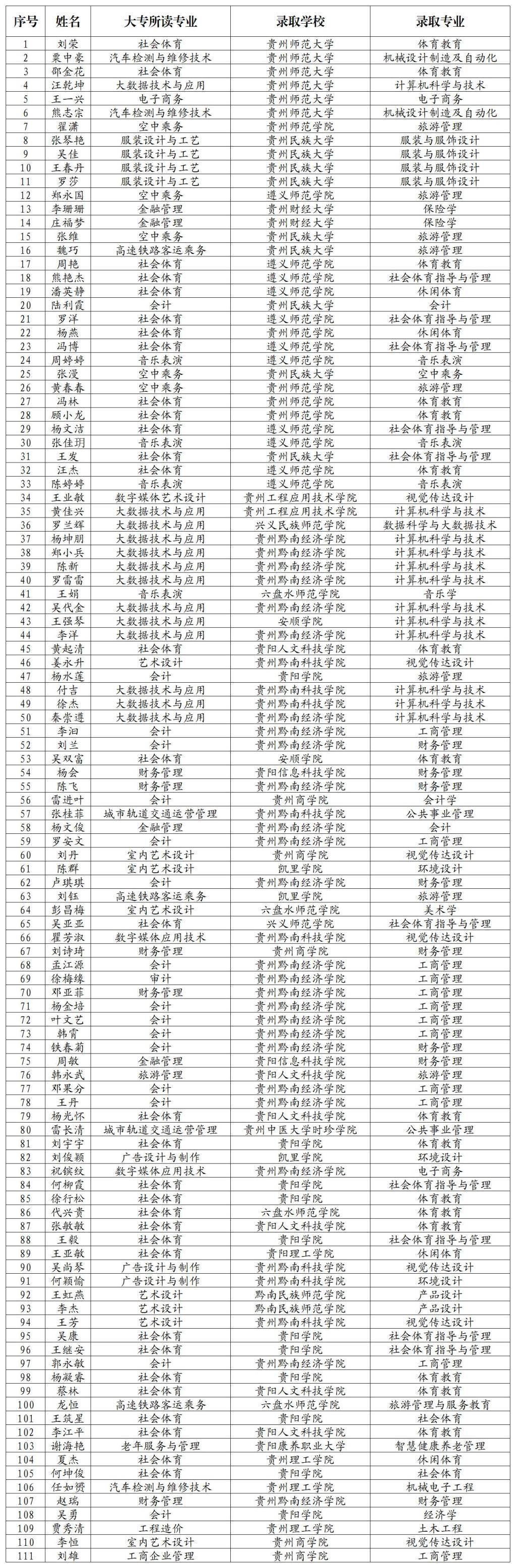 星光不问赶路人,天道酬勤佳音来。在贵州省2023年普通高校“专升本”考试中,我校学生成绩优异,再创佳绩。今年我校共有268名学生报名参加“专升本”考试,14名退役大学生报名,文化分数上线189人,最终111名学生金榜题名,他们分别被贵州师范大学、贵州民族大学、贵州财经大学、贵州师范学院、贵州理工学院、遵义师范学院、六盘水师范学院、兴义师范学院、凯里学院等本科院校录取。艰难方显勇毅,磨砺始得玉成。三年磨一剑,学子终有成!在此,向顺利通过2023年“专升本”考试的同学表示衷心的祝贺!祝愿111名学子,在新的学习环境中,继续努力,勇攀高峰,实现人生梦想!