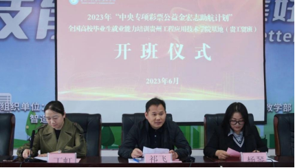 2023年6月5日,“中央专项彩票公益宏志助航计划”全国高校毕业生就业能力培训贵州工程应用技术学院基地(贵工贸班)在综合楼二楼报告厅举行开班仪式。校党委委员、副校长祁飞,贵州工程应用技术学院学生处副处长丁虹,我校140余名2023届毕业生参与开班仪式,开班仪式由就业办主任杨琴主持。