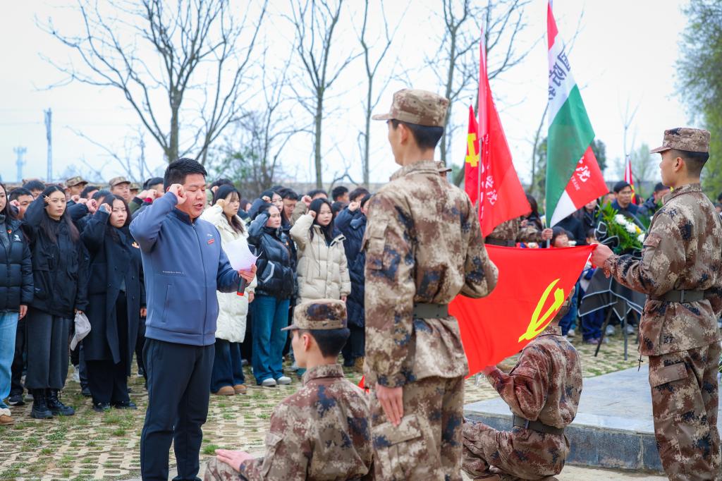江燕虎带领全体团员重温入团誓词。在鲜艳的团旗下,团员们举起右手,庄严宣誓,誓言铿锵有力,响彻陵园。通过重温入团誓词,进一步坚定团员的理想信念,增强青年学子的责任感和使命感。