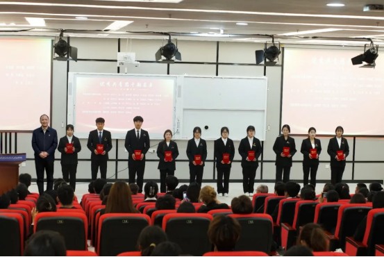 校团委干事闵鑫为“优秀共青团员”代表颁发荣誉证书,肯定他们在思想、学习和生活中展现出的优秀品质;