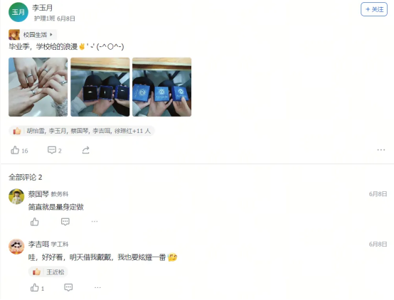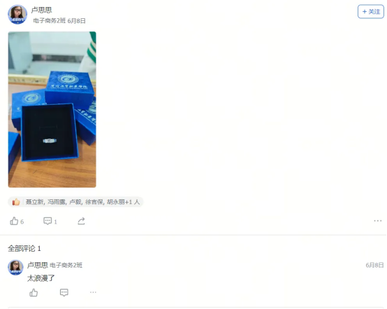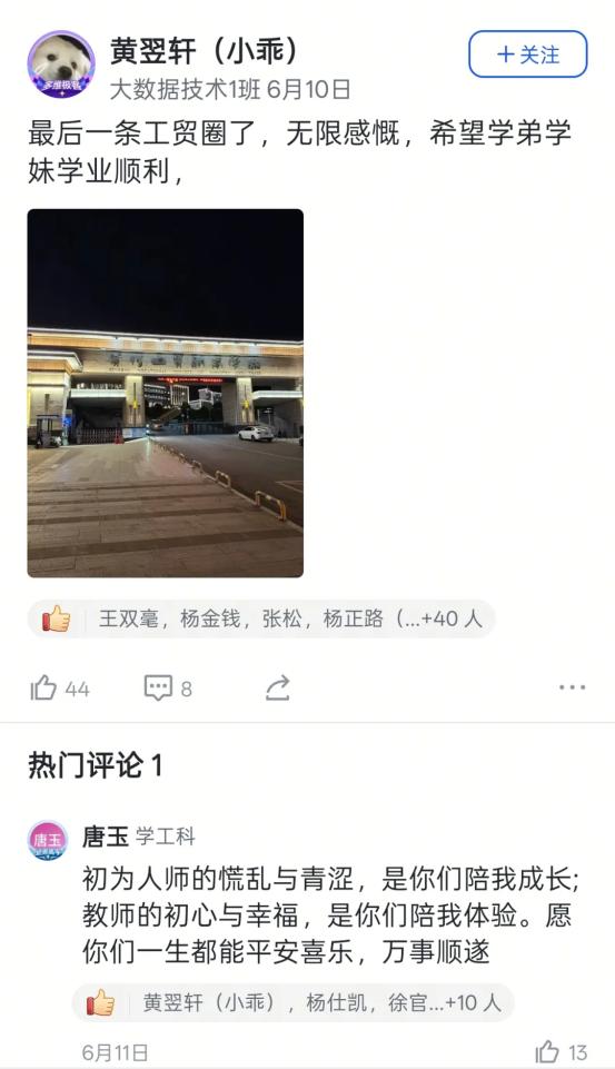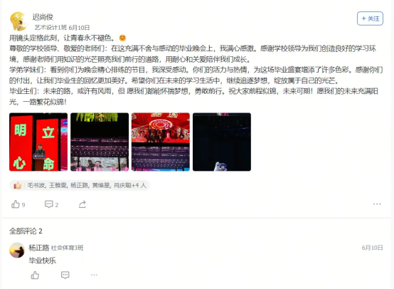 艺术设计1班的迟同学在毕业晚会后飞书工贸圈的深情致谢,大数据技术1班的黄同学发出的“最后一条工贸圈,无限感慨,祝学弟学妹们学业顺利!”及其评论区里唐玉老师“初为人师的慌乱与青涩,是你们陪我成长”的动情回应……这一条条动态,一声声祝福,一幅幅定格在飞书工贸圈里的鲜活画面与肺腑之言,早已超越了简单的社交分享。它们无声地串联起散落天涯的思念,凝聚成贵工贸这个大家庭最温暖、最坚韧的情感纽带。在这个注定要各自远航的夏天,工贸圈成为盛放离愁别绪、传递无尽祝福的云端港湾,让“beat365中文官方网站永远是你们的家”这句承诺,有了触手可及的温度与回响。