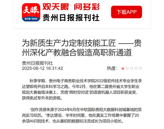编者按:本文原发天眼新闻客户端。秋季学期,贵州电子商务职业技术学院2022级软件技术专业学生李达望即将开启本科学习之路。今年2月,他在第二届贵州省大学生职业规划大赛省级决赛上,凭借“跨时空对话”的语音机器人项目斩获金奖,获得免试专升本的资格。