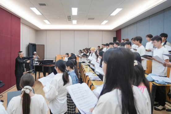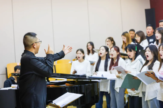 在首日《黄水谣》排练中,杨力教授不仅深入解析作品的情感结构与音乐统一性,还通过实际指挥演示,使教师和学生共同体会到合唱声音、呼吸、咬字及表情高度统一的重要性。我校音乐学院青年教师们表示,通过杨教授的现场指导,对如何引导学生处理旋律流动与情绪转折有更清晰的教学思路。在现场的同学们则表示,在练习中掌握如何通过连贯流畅的演唱传递河水般起伏的音乐意象。
