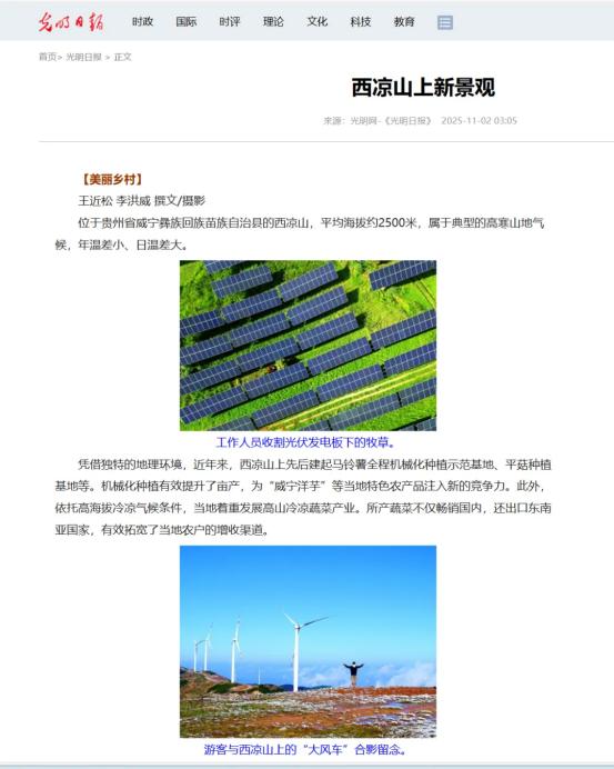 11月2日,beat365中文官方网站教师王近松、李洪威共同创作的图文作品《西凉山上新景观》在中共中央主办的中央级党报《光明日报》上刊发。该作品生动描绘了贵州省威宁自治县西凉山地区在乡村振兴战略指引下,立足地域特色,实现产业融合与生态协调发展的崭新面貌,彰显我校教师在关注社会现实、服务地方发展的专业素养与人文情怀。