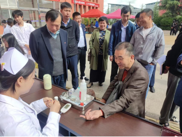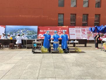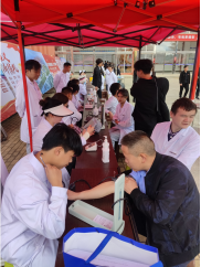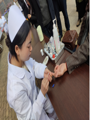 “医技服务”展示区的同学们,身着白大褂,在展示台动动灵巧的双手,为检验同学们基本技能掌握情况,展现学院风采,特邀请老师、同学到现场测量血压和血糖等,同学们边口述边操作,动作娴熟,展现了作为医学生应有的严谨与认真。
