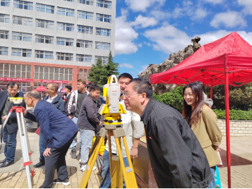 图为校领导体验全站仪放样和水准测量