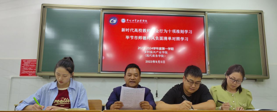 年9月5日下午,乡村振兴产业学院(现代商务学院)在三教南区307召开违反高校教师职业行为十项职业准则典型案例警示教育暨毕节市师德师风负面清单对照学习专题会议,动员全院教师树师德、立师表、铸师魂、强师能、正师风,提高自身素质,以饱满的工作热情和一流的工作业绩,推动学院又好又快发展。会议由办公室主任袁优主持。