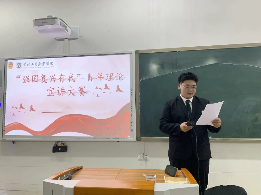 为深入学习贯彻习近平新时代中国特色社会主义思想和党的二十大精神,落实“强国复兴有我”主题宣传,引导广大青年学生自觉把思想和行动统一到党的二十大精神上来,大力营造凝心聚力、团结奋斗的浓厚社会氛围。11月9日晚上,乡村振兴产业学院(现代商务学院)于三号教学楼第二阶梯教室举办了“强国复兴有我”主题宣讲比赛。本次评委由乡村振兴产业学院(现代商务学院)团总支书记袁优、团学科员夏婷老师及辅导员欧阳云雪老师担任。活动由2023级高速铁路客运服务(1)班赵柏添同学主持。