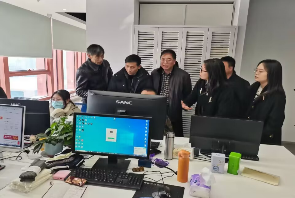 图为走访调研团队深入聚学企业的电商客服、电商运营及直播等职场工作岗位现场,了解电子商务各项业务的后台运作情况。