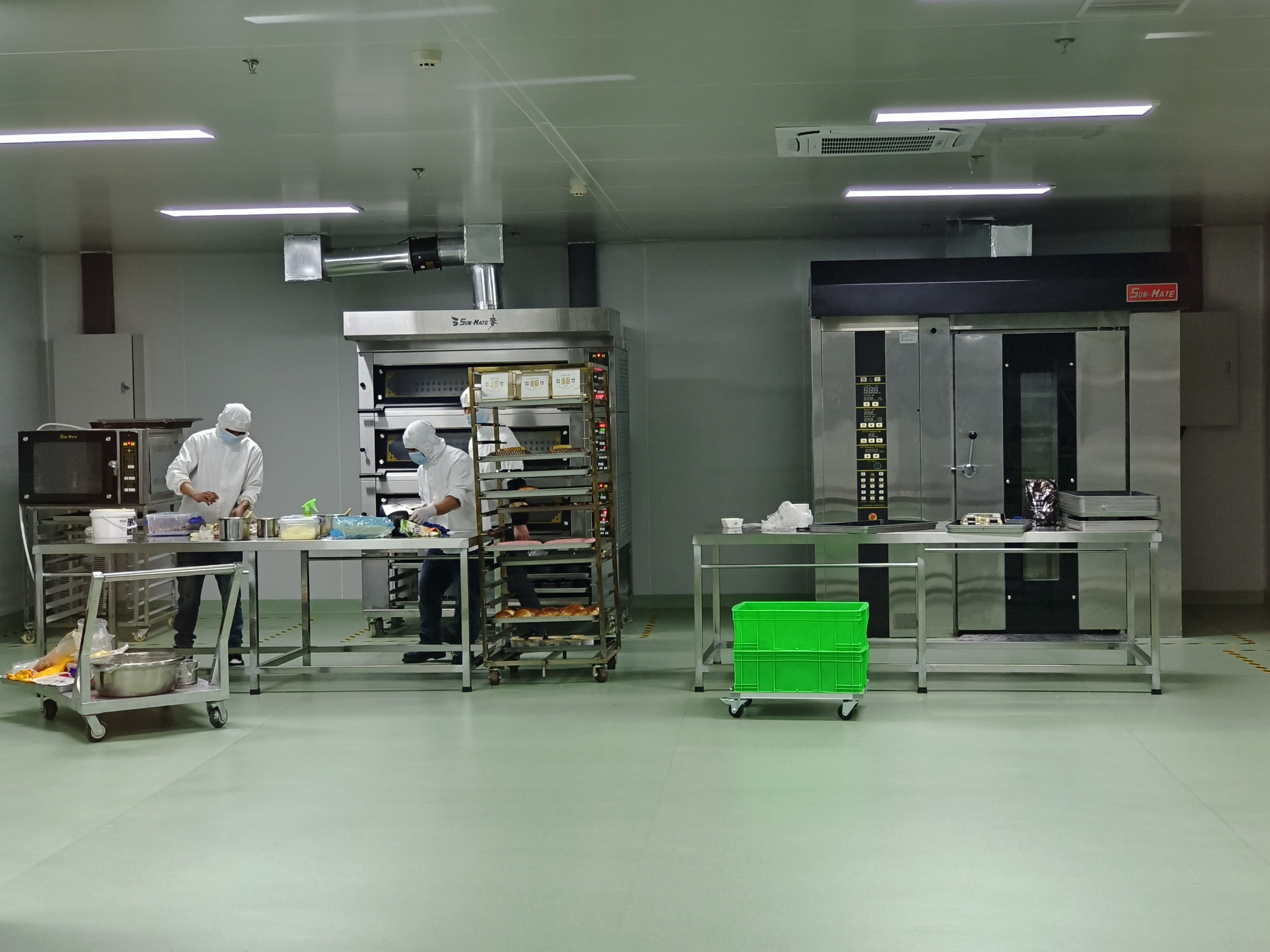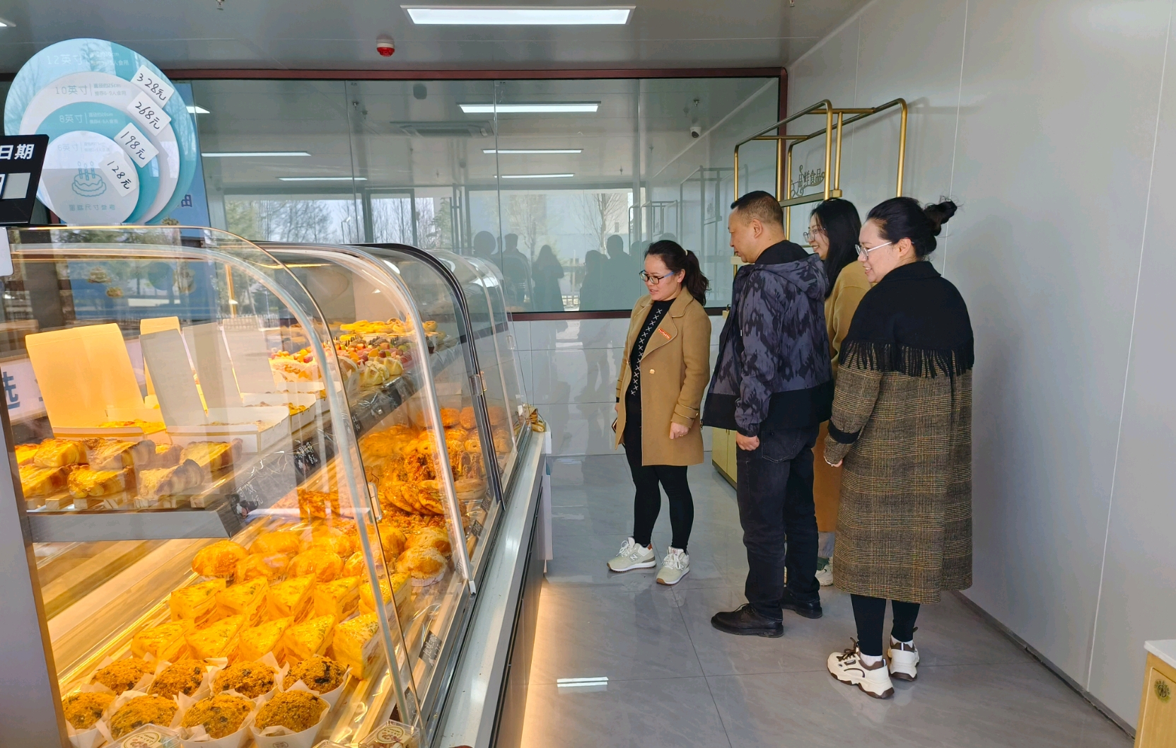 图为杨一梅及食品专业教师到一品鲜烘焙食品体验中心查看刚生产的各类糕点,并了解烘焙过程及使用原料。同李总探讨了即将开展《焙烤食品加工技术》课程学生观摩实训课的相关工作准备。