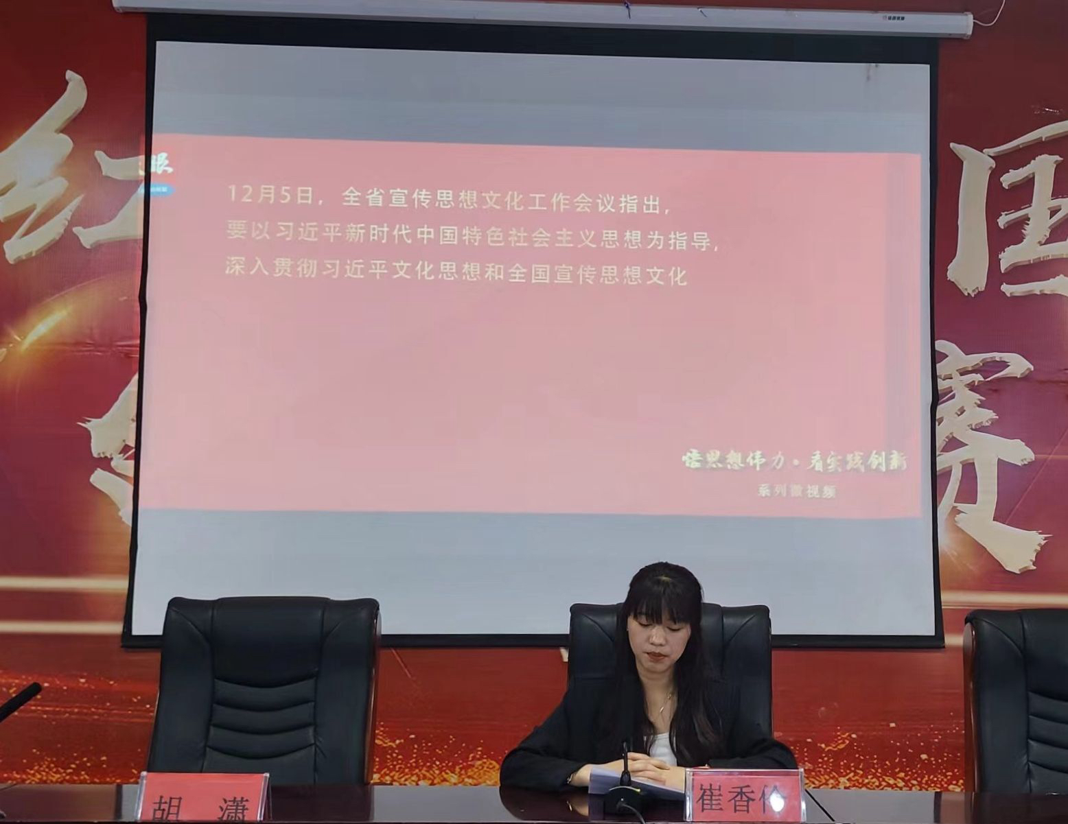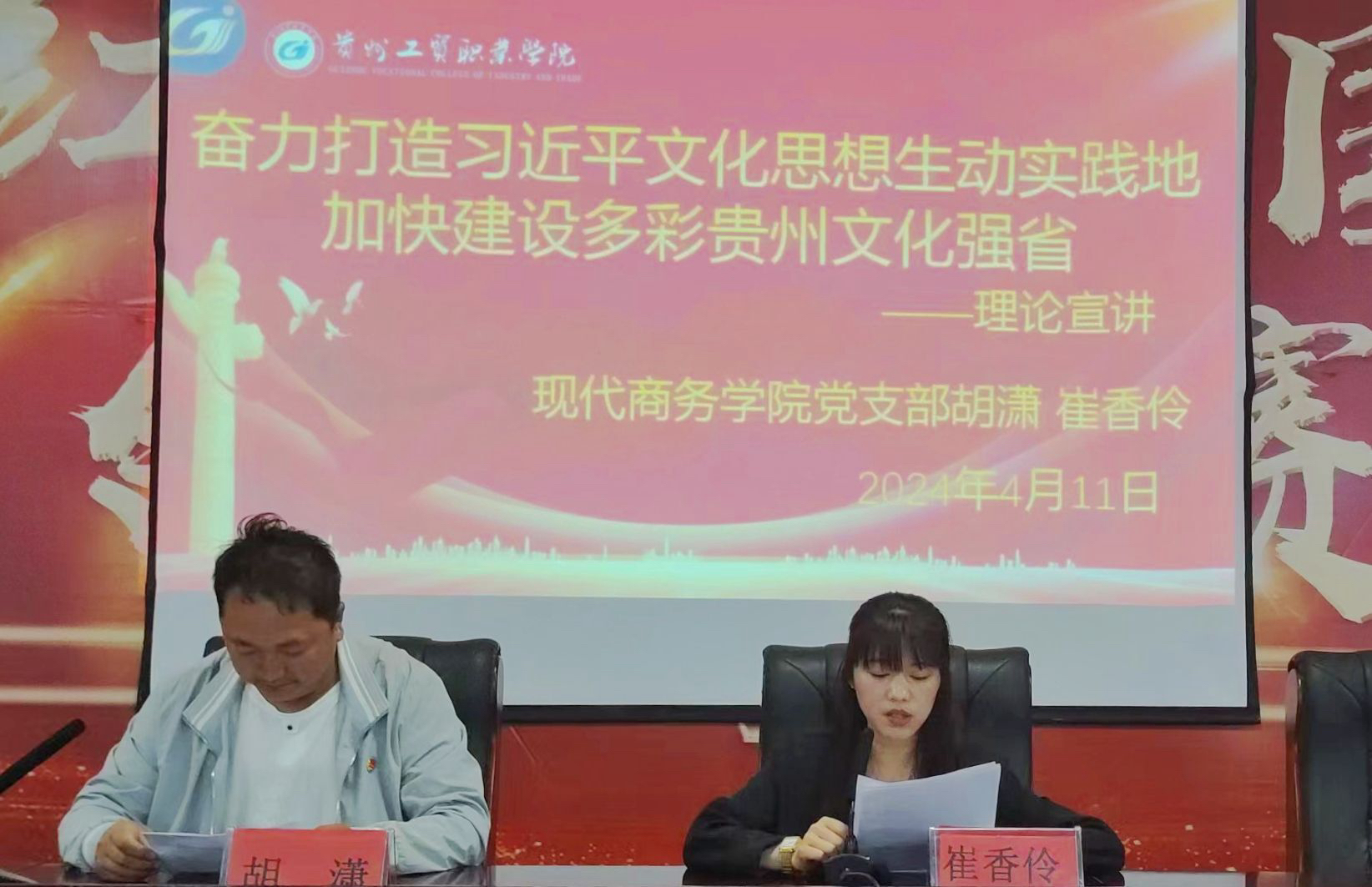 为深入学习贯彻习近平新时代中国特色社会主义思想,增强我院师生对多彩贵州文化强省建设重要性的认识。4月11日晚,现代商务学院党支部在草海大讲堂开展了“奋力打造习近平文化思想生动实践地,加快建设多彩贵州文化强省”的专题理论宣讲二人讲活动,由支部组织委员崔香伶和党员胡潇两位同志主讲,现代商务学院全体党员、学生会、各班团支书及学生代表参加了此次活动。