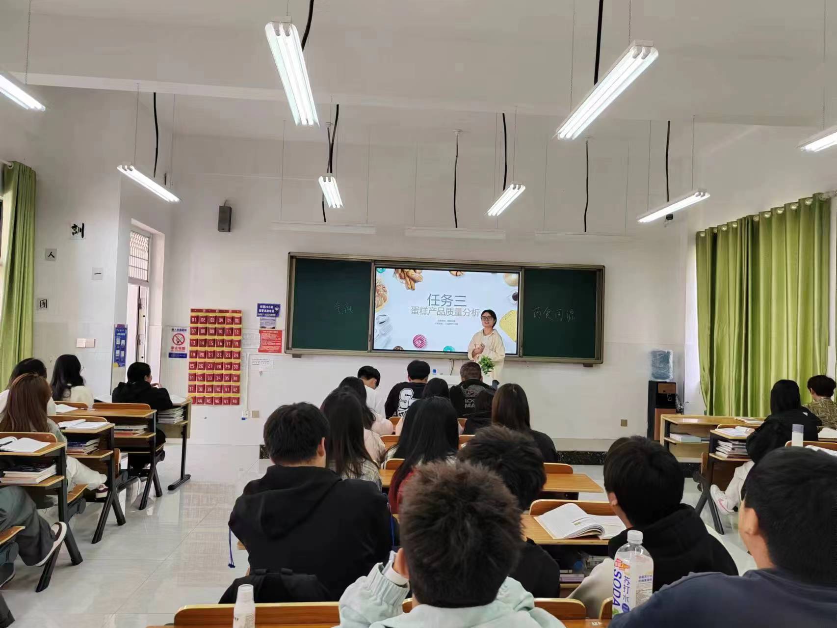 欧阳云雪老师以一品鲜产教融合中心的蛋糕制作为切入点,展示了《蛋糕产品质量分析》的课堂教学,由浅入深,循序渐进,用图片等形式引导学生了解蛋糕的制作过程。师生互动与生生互动活跃了课堂气氛,激发了学生的课堂参与度。