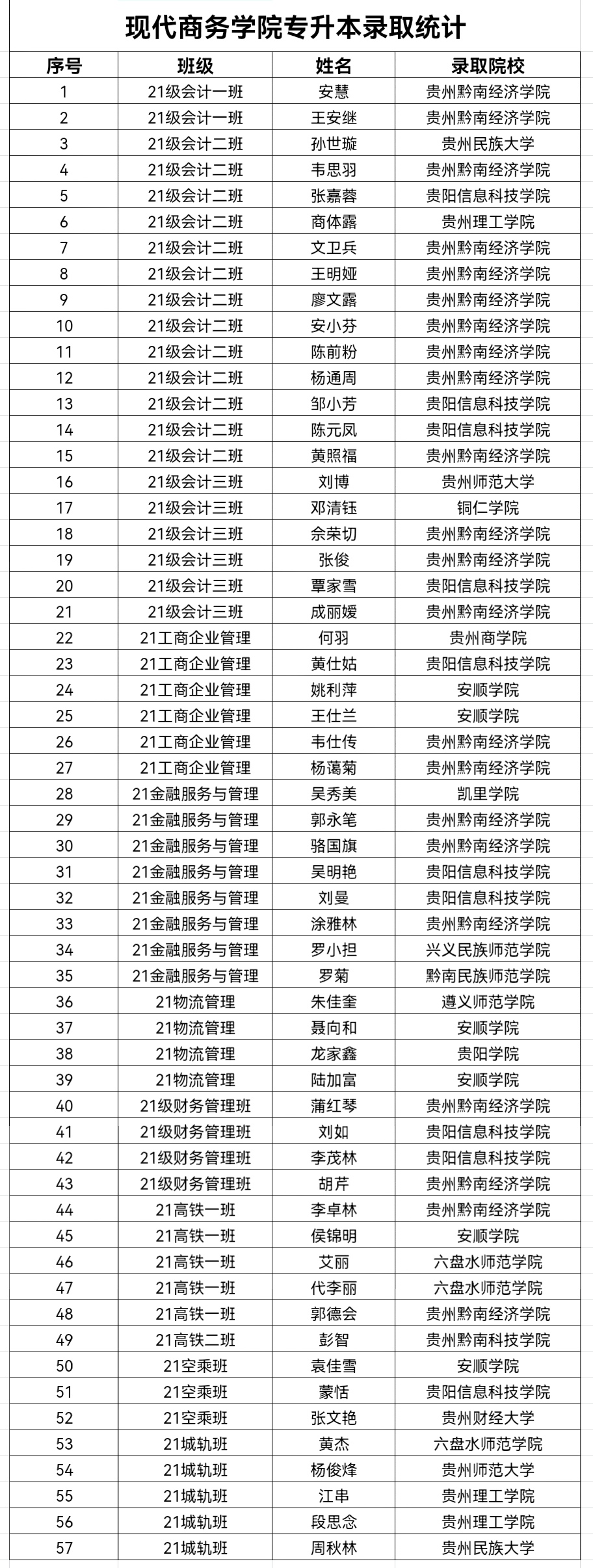 少年不惧岁月长,彼方尚有荣光在。近日,贵州省2024年“专升本”招生考试录取工作圆满结束,现代商务学院(乡村振兴产业学院)2021级学生在“专升本”考试喜获佳绩。我院孙世璇、张文艳、杨俊烽、商体露、吴秀美、何羽等57名同学,分别被贵州民族大学、贵州财经大学、贵州师范大学、贵州理工学院、凯里学院、贵州商学院等本科学校录取。上线率达67.9%。