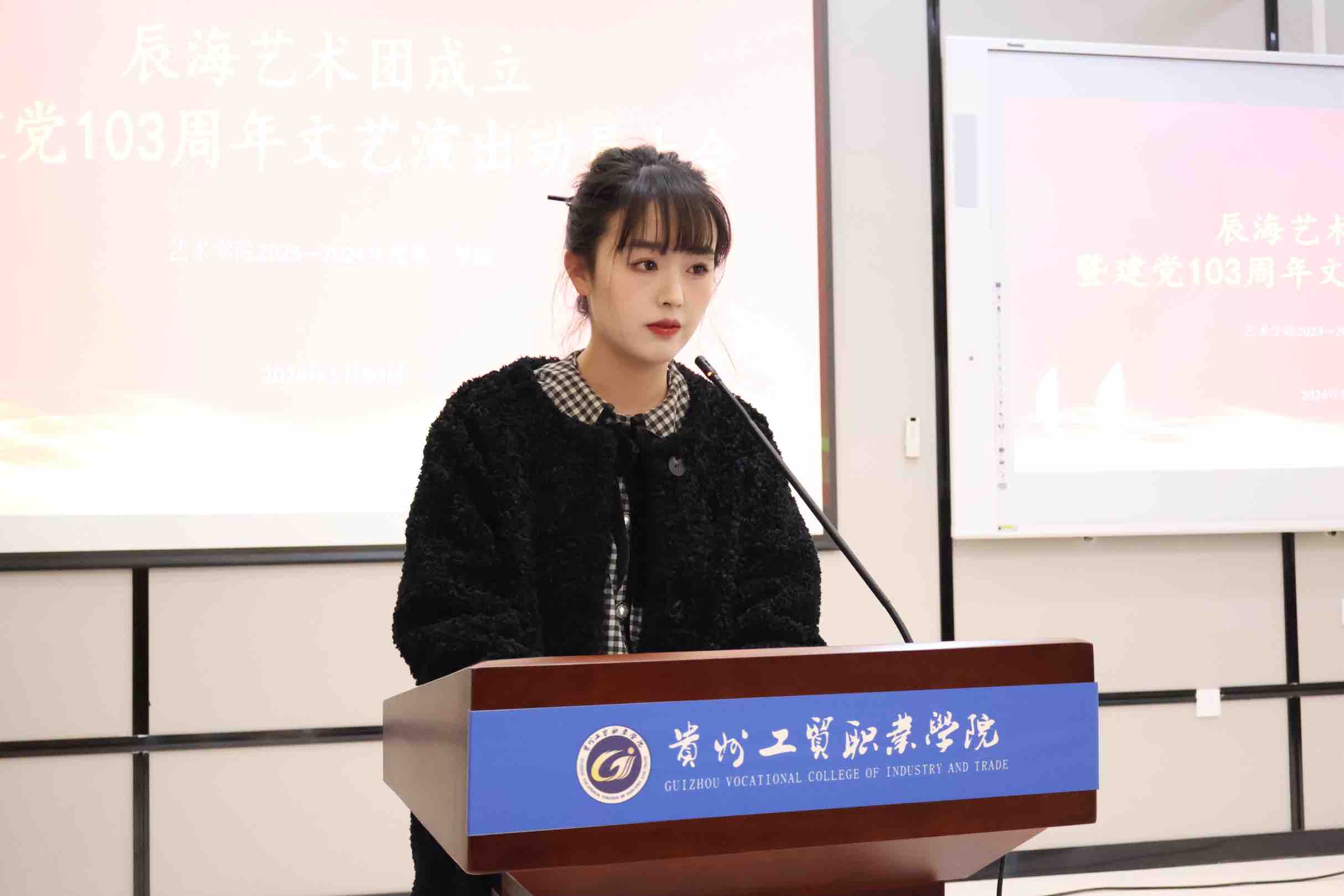 宋新乐对艺术团的成立表达了祝贺,预祝建党103周年文艺演出取得成功。他表示:艺术是人类文明的瑰宝,它能够陶冶情操、丰富生活,艺术是培养学生全面发展的重要途径,辰海艺术团的成立为同学们提供一个展示才华、交流学习的平台,这将进一步推动我校校园文化的繁荣。