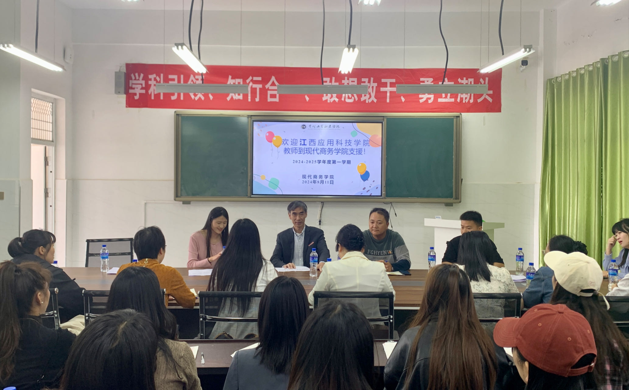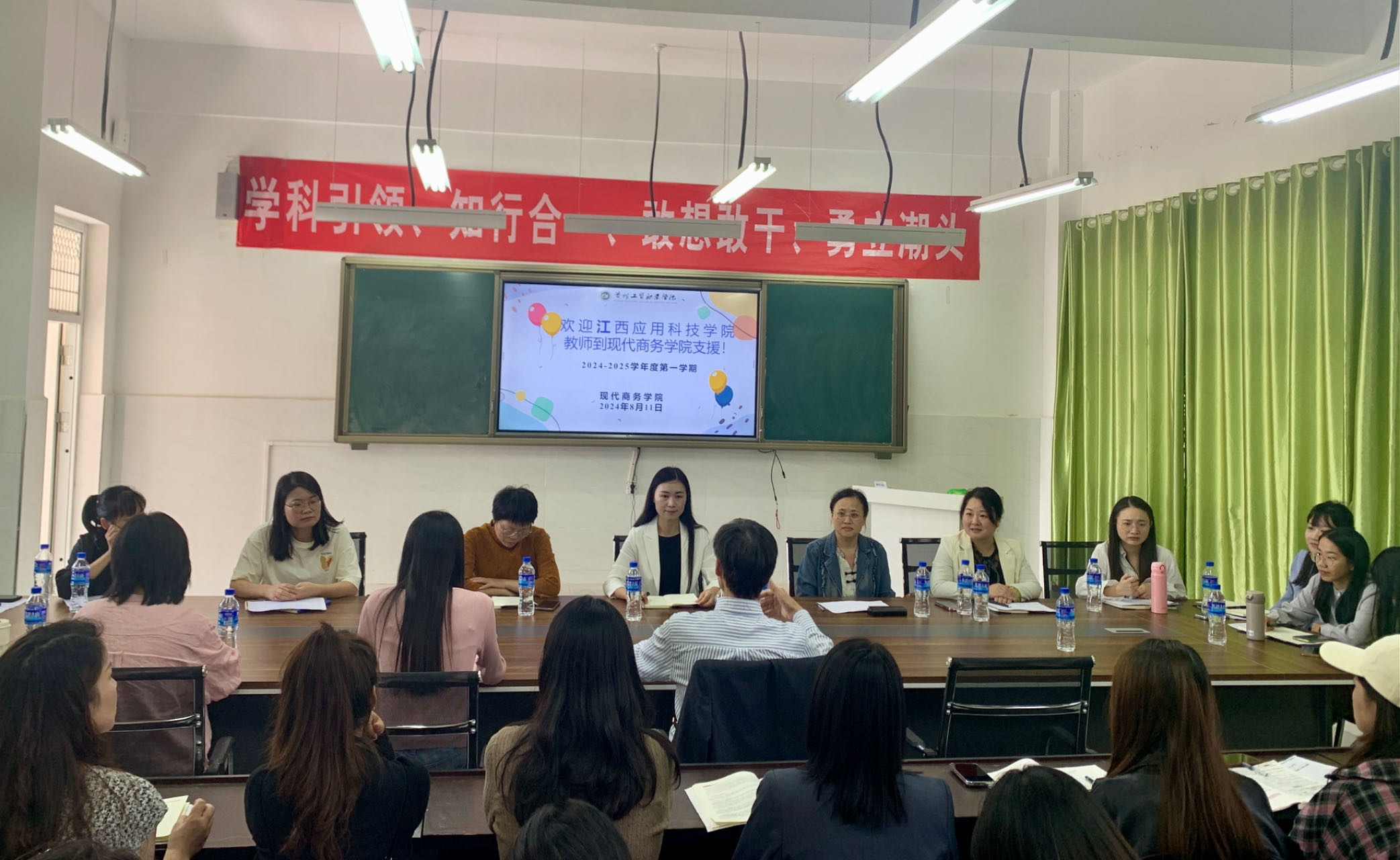 在深化教育合作、促进教育资源均衡发展的背景下,为进一步提升beat365中文官方网站教学质量与师资水平,江西应用科技学院选派了一批优秀的专家、教授团队前往beat365中文官方网站现代商务学院(乡村振兴产业学院),开展为期一个月的教学帮扶支援工作。此次活动旨在通过交流互鉴、资源共享,助力beat365中文官方网站现代商务学院(乡村振兴产业学院)打造高素质的教师队伍,推动学院教育教学改革与发展。同时,也标志着两校在深化合作、共谋发展上迈出了坚实的一步。8月11日下午,现代商务学院在三教东区307会议室举办江西应用科技学院优秀教师赴我院教学工作见面会。校党委委员、副校长、勒系琳,学院党支部书记胡潇,办公室主任袁优及全院教职工、江西应用科技学院优秀教师参会,会议由袁优主持。