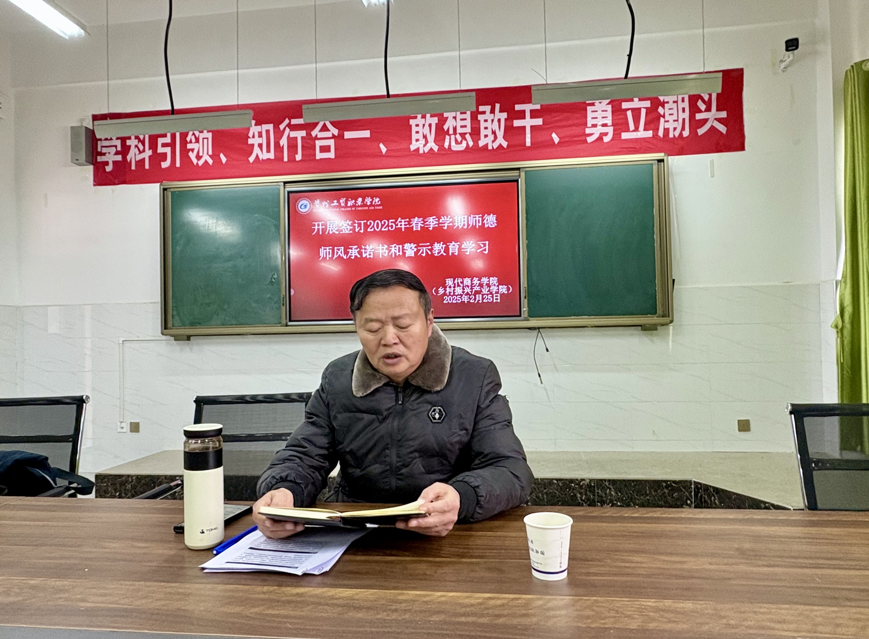 张凤玉表示,将全力配合学院工作,重点推进强化党支部政治功能,推动党建与业务“双融双促”。完善学生心理健康与就业服务体系,实现毕业生高质量就业。实施辅导员能力提升计划,打造专业化学生管理队伍。会议最后,全体教职工开展专题学习:黄教珍领学《新时代高校教师职业行为十项准则》,从坚定政治方向、传播优秀文化、坚守学术诚信等方面明确职业规范。张凤玉主持师德师风警示教育学习,通过剖析典型案例,警示教职工以案为鉴、自省自纠,并现场组织全员签署《师德师风承诺书》,进一步强化了教职工的师德师风建设意识。