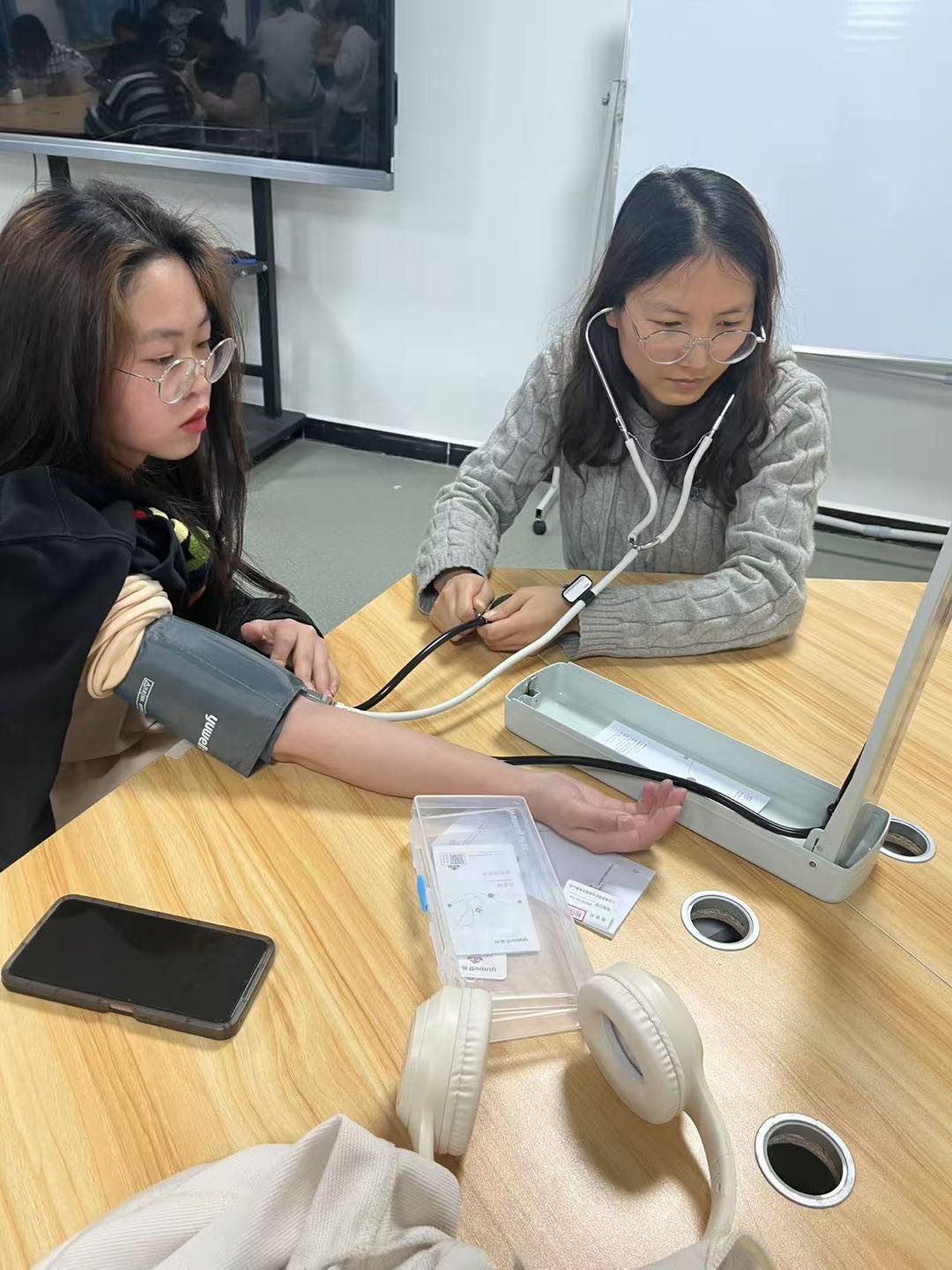 学生分组采用"双盲交叉验证法",轮换医护角色,严格遵循设备校准、体位调整、袖带定位、听诊监测标准化流程。手持记录表专注比对数据,针对听诊间隙判别、袖带压力控制等细节热烈研讨,部分小组延伸探索运动对血压的影响规律,形成"实践-反思-提升"闭环