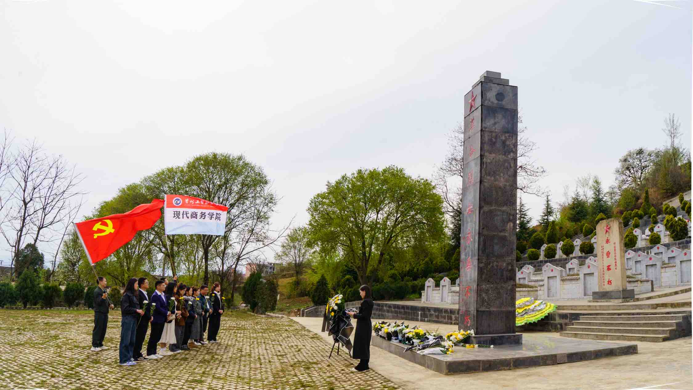 青山埋忠骨,史册载功勋。在这个缅怀先烈、寄托哀思的四月,4月8日,现代商务学院党支部组织全体党员教师和学生党员代表,怀着无比崇敬的心情,齐聚沙河边烈士陵园,开展了一场以“祭先烈 强党性 促发展 践初心”为主题的庄重肃穆的祭扫活动,向为国家独立、民族解放事业英勇献身的先烈们致以最崇高的敬意。烈士陵园内,翠柏凝春,气氛庄严肃穆。全体党员整齐列队,身姿挺拔,神情凝重。随着主持人庄重而肃穆的声音响起,活动正式拉开帷幕。刹那间,现场一片寂静,全体人员垂首默哀1分钟。在这短暂却又漫长的60秒里,大家思绪万千,仿佛穿越时空,与先烈们进行了一场灵魂的对话,深刻体会到今日的和平与繁荣来之不易,是无数革命先烈用热血和生命铸就。