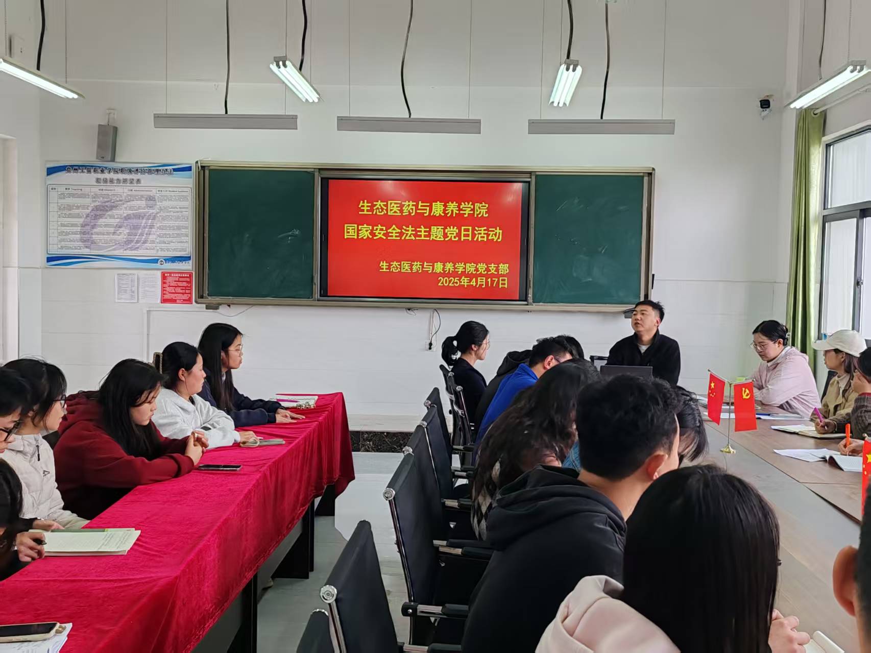 为深入学习总体国家安全观,强化党员师生的国家安全意识与责任担当,4月17日,生态医药与康养学院在三教东区110会议室开展“筑牢国安防线,医养先锋先行”主题党日活动。党支部书记赵英涛、全体党员及积极分子参加,共上国家安全“必修课”。