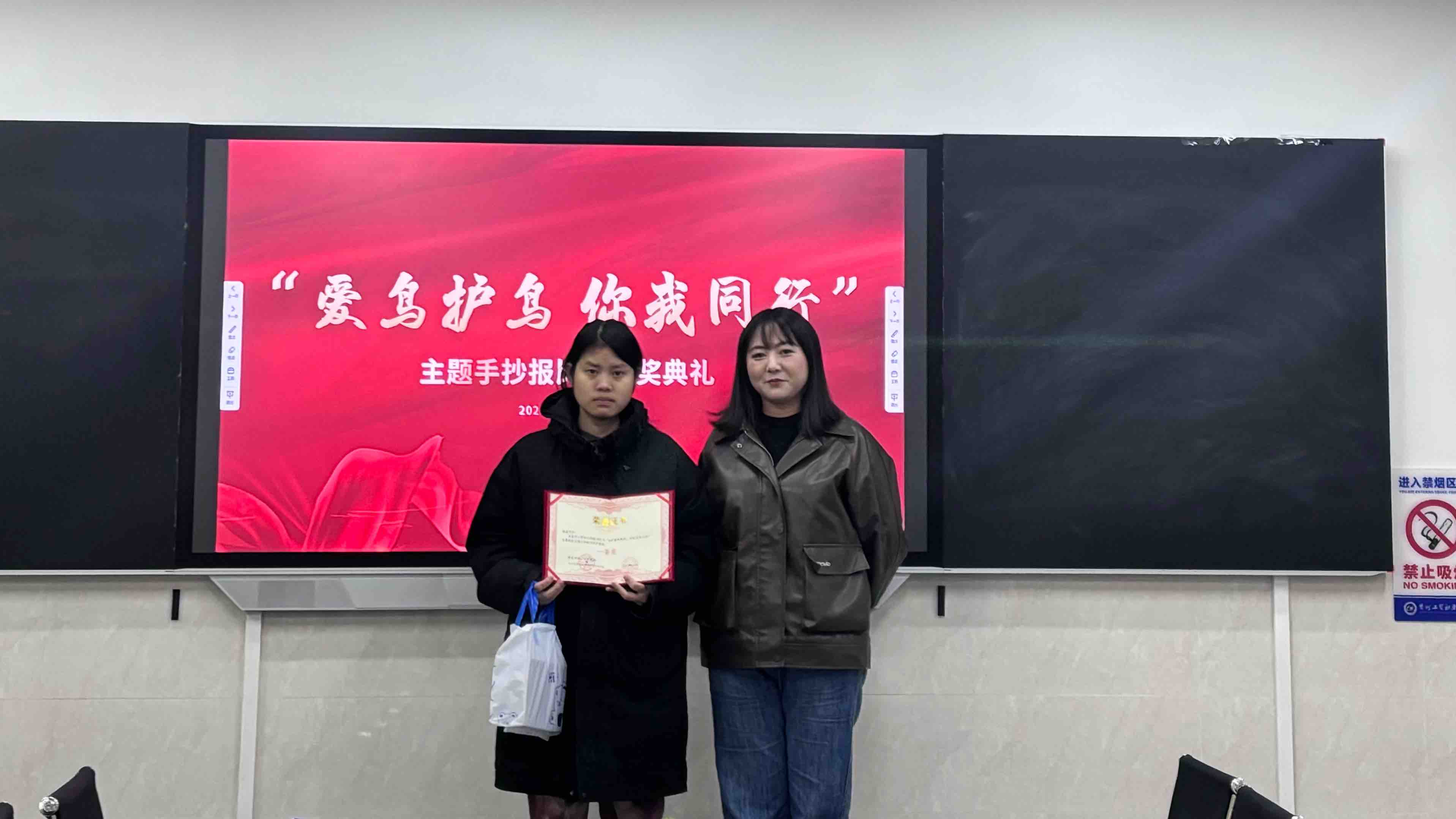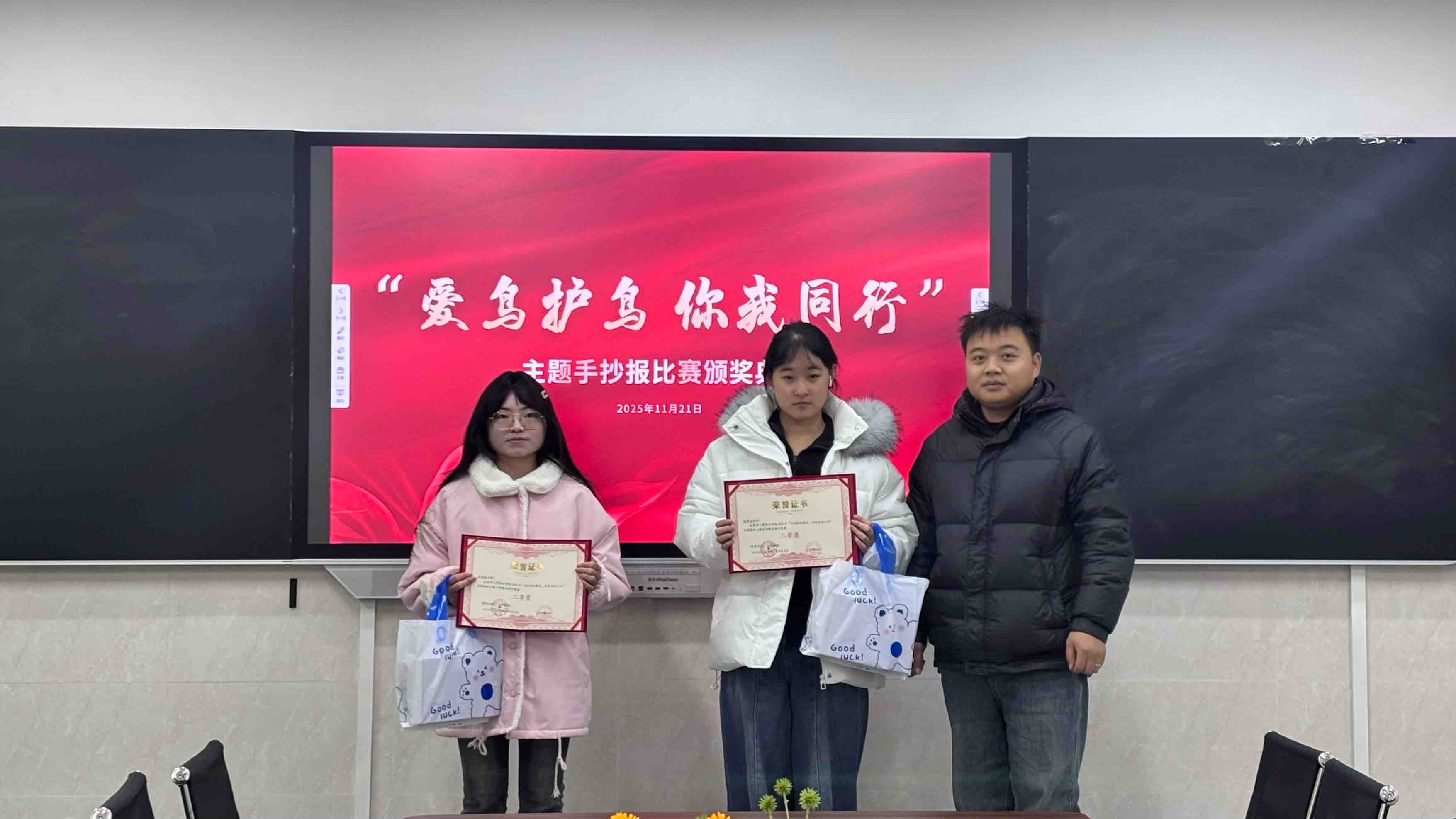 三等奖的荣誉由辅导员代表周佳意颁发,鼓励同学们持续发挥艺术才华,关注社会生态。