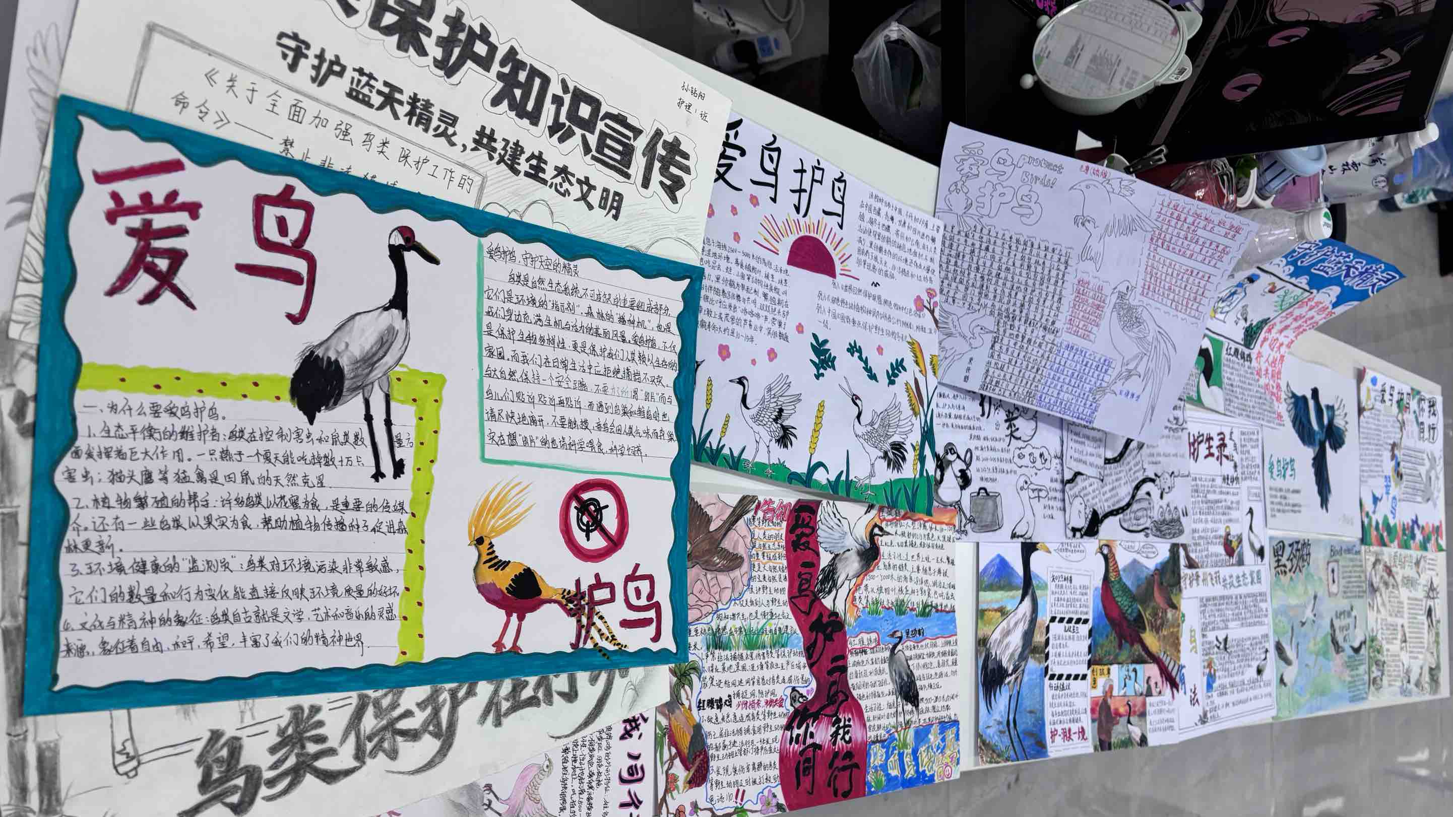 自活动启动以来,赛事在艺术学院和其他学院掀起了关注鸟类、保护生态的热潮。同学们踊跃参与,倾情创作,提交的作品紧扣主题,内容丰富,形式多样。一幅幅精美的手抄报或聚焦贵州省珍稀鸟类如黑颈鹤、红腹锦鸡的灵动神韵,科普其习性特征;辅导员们宣传相关政策法规,倡导抵制非法捕猎、贩卖、食用鸟类的不法行为;或发出保护栖息地、不扰鸟类等相关知识讲解;更不乏以创意故事描绘人与鸟类和谐共处的温馨画面。作品均采用手绘形式,于方寸A3或8开素描纸间,巧妙构图,色彩斑斓,书写工整,充分展现了校园学子扎实的专业功底、丰富的想象力以及对生态保护事业的深刻思考与热忱担当。