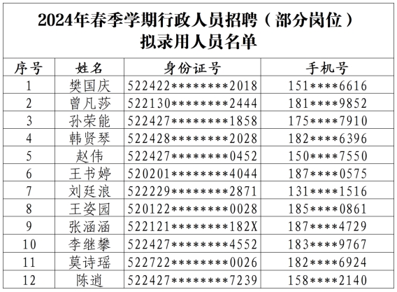 根据《beat365中文官方网站2024年春季学期行政人员招聘公告》要求,经简历筛选、面试、综合评价,学校研究决定,拟聘用以下同志到我校工作,现予以公示: