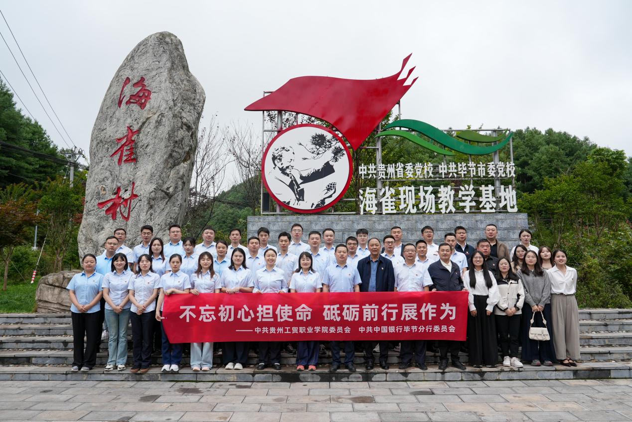 9月19日,学校党委与中国银行毕节分行党委联合前往毕节市赫章县海雀村文朝荣党性教育基地开展党建共建、党建带团建活动,学校党委班子成员、党员代表共计15人参加,毕节分行党委班子成员、党支部书记、新发展党员,优秀党员、团员代表40人参加。活动伊始,中国银行毕节分行党委一行到校参观交流,对“样板党支部”艺术学院党支部、辰海大剧院、图书馆红色阅览室的建设给予高度肯定。双方就过往合作成果、人才培养、智慧校园建设、党建共建等进行座谈交流,达成多项共识。