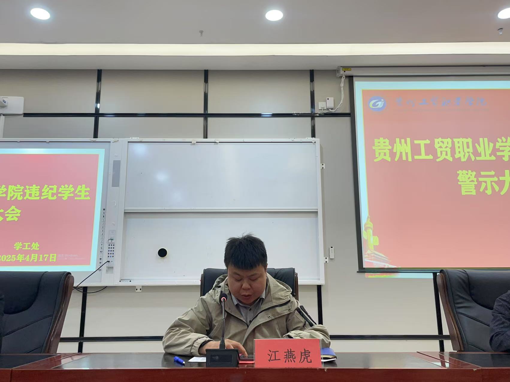 江燕虎通报本学年开学以来学生违纪情况,结合具体案例进行成因分析,以数据与事实为基础,为全体参会人员呈现校园纪律管理现状,敲响遵规守纪的思想警钟。