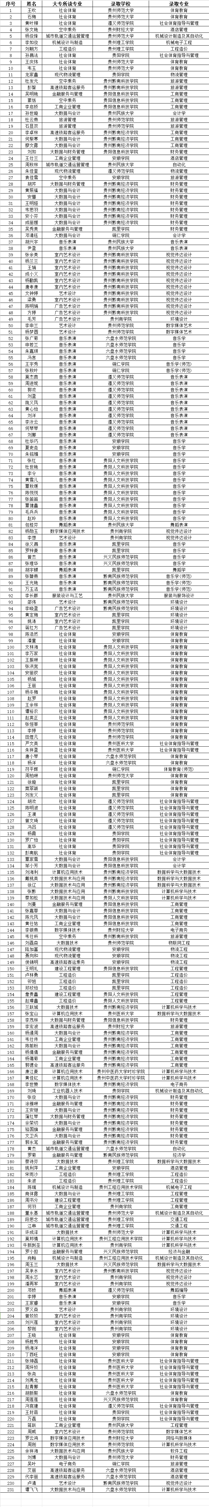 “知不足而奋进,望远山而前行”,理想的风终于吹进现实,我们不停奔跑只为追赶当年被给予厚望的自己。披荆斩棘走过的路,终将会繁花满地,满载理想的帆船,终将上岸。少年不惧岁月长,彼方尚有荣光。2024年贵州省普通高校专升本考试圆满落幕,录取结果已揭晓。在学校领导的高度重视下,在各学院和各部门全体教师的共同努力下,今年的专升本考试工作圆满完成!今年我校共有477名学生报名参加”专升本“考试,其中文化分数上线317人,最终231名学生金榜题名,他们分别被贵州师范大学、贵州民族大学、贵州财经大学、贵州理工学院、遵义师范学院、兴义师范学院、六盘水师范学院、凯里学院等本科院校录取。