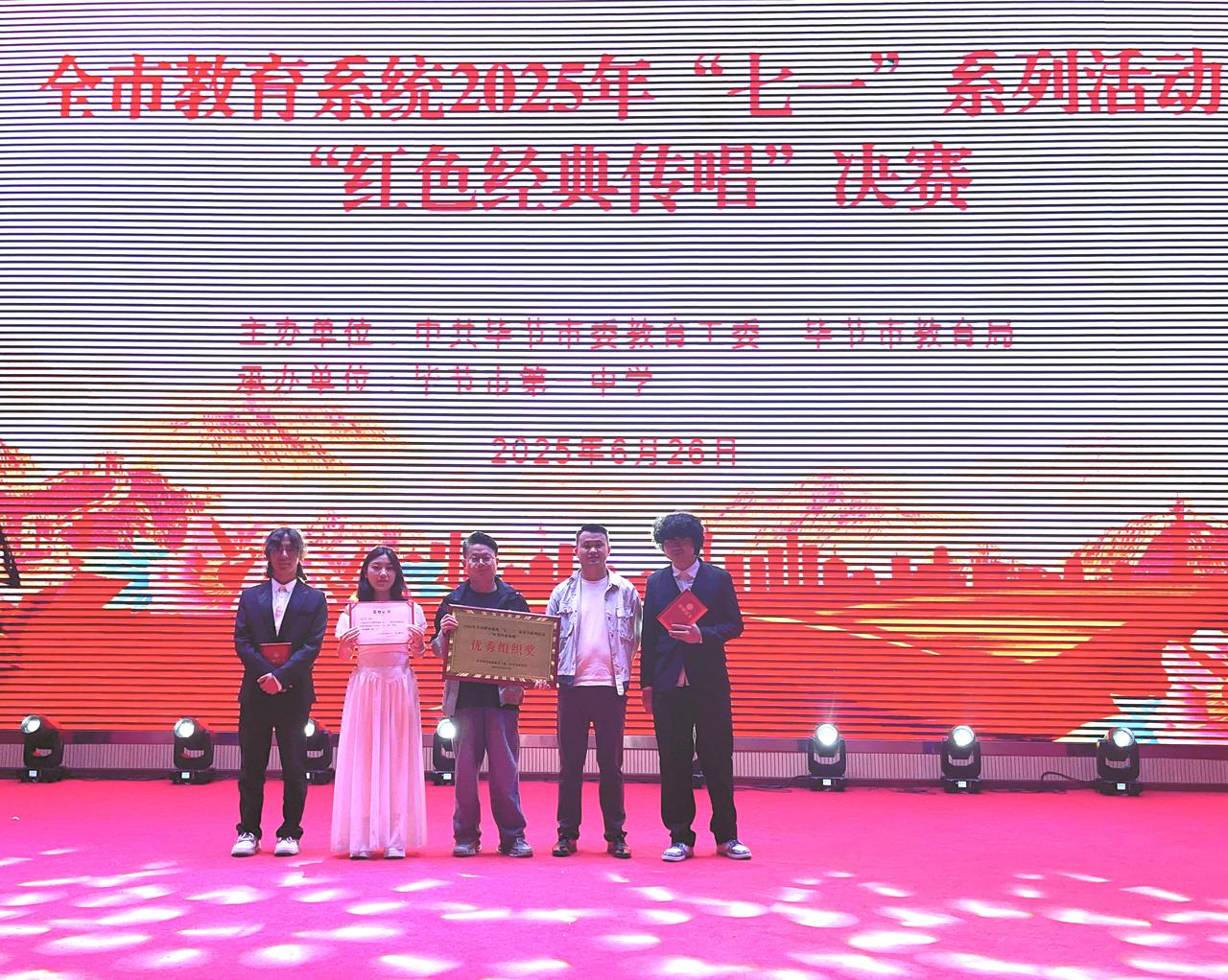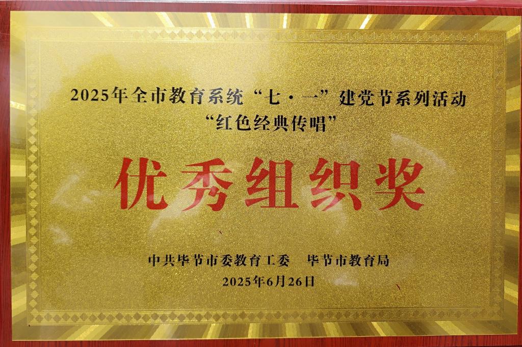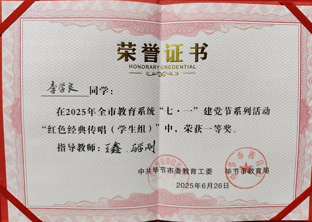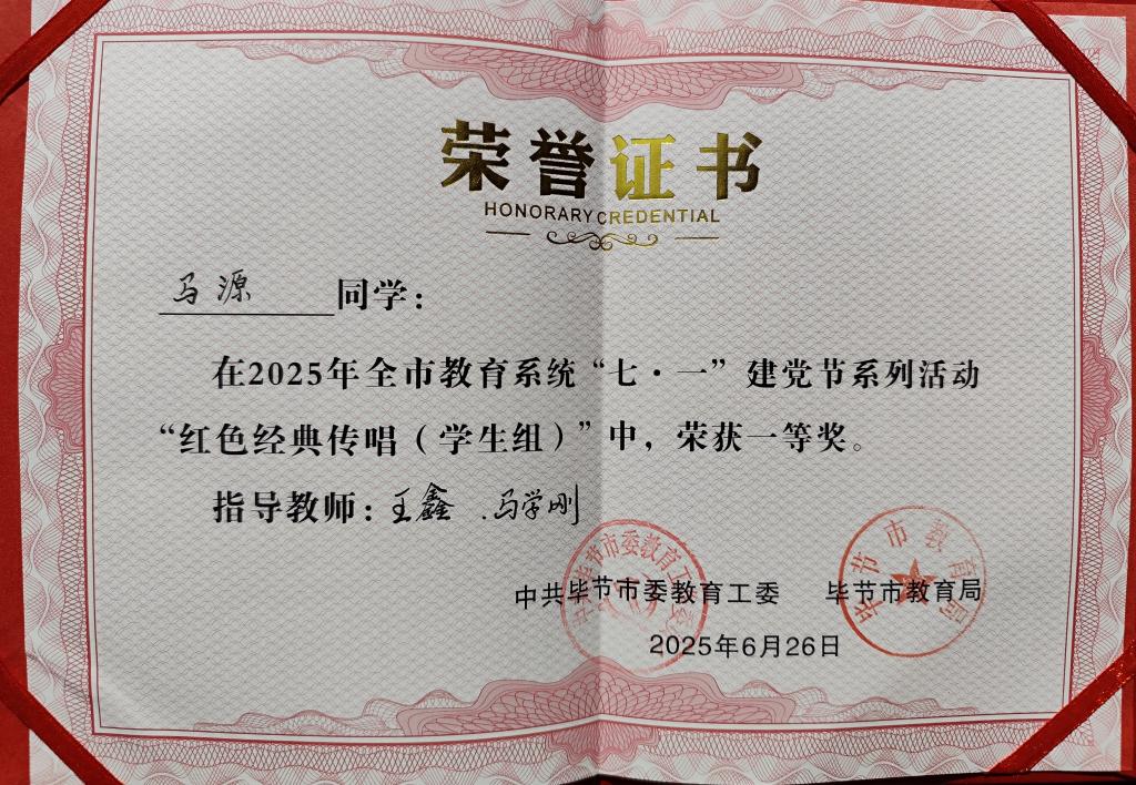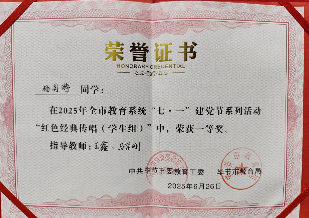 6月26日,由中共毕节市委教育工委、毕节市教育局举办的全市教育系统2025年“七一”系列活动“红色经典传唱”决赛中,beat365中文官方网站艺术学院学子杨周游、李学良、马源用一首《红旗飘飘》一举揽获“红色经典传唱(学生组)”一等奖,学校荣获“优秀组织奖”!