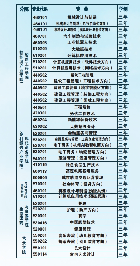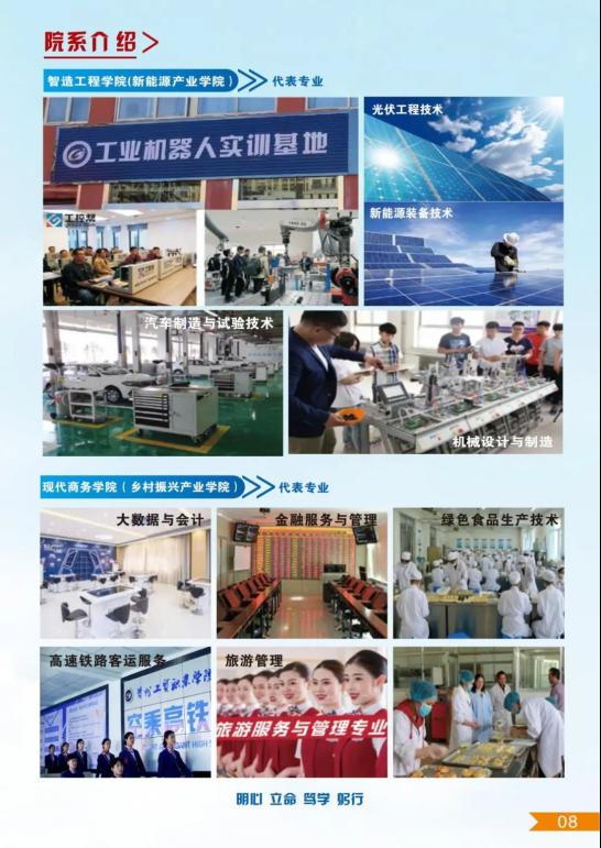学校依托集团化办学优势,对接区域产业发展,强化资源配置,优化专业布局,围绕“新能源”“智能制造”“现代商务”“健康服务”“高雅艺术”五大行业,设置了智造工程学院、现代商务学院、国防教育与体育学院、生态医药与康养学院、艺术学院、马克思主义学院、公共基础教学部等7个二级教学单位,开设了新能源装备技术、工业机器人技术、绿色食品生产技术、护理、中医康复技术、音乐表演等31个专业,配套建设了汽车服务工程、工业机器人、光伏工程技术、护理、绿色食品加工、健身体育、音乐表演等29个校内实验实训基地,还有广播电视中心、图文信息中心、体育运动中心、民族艺术中心、“一站式”社区服务中心和创新创业中心等大学生文化活动场所。