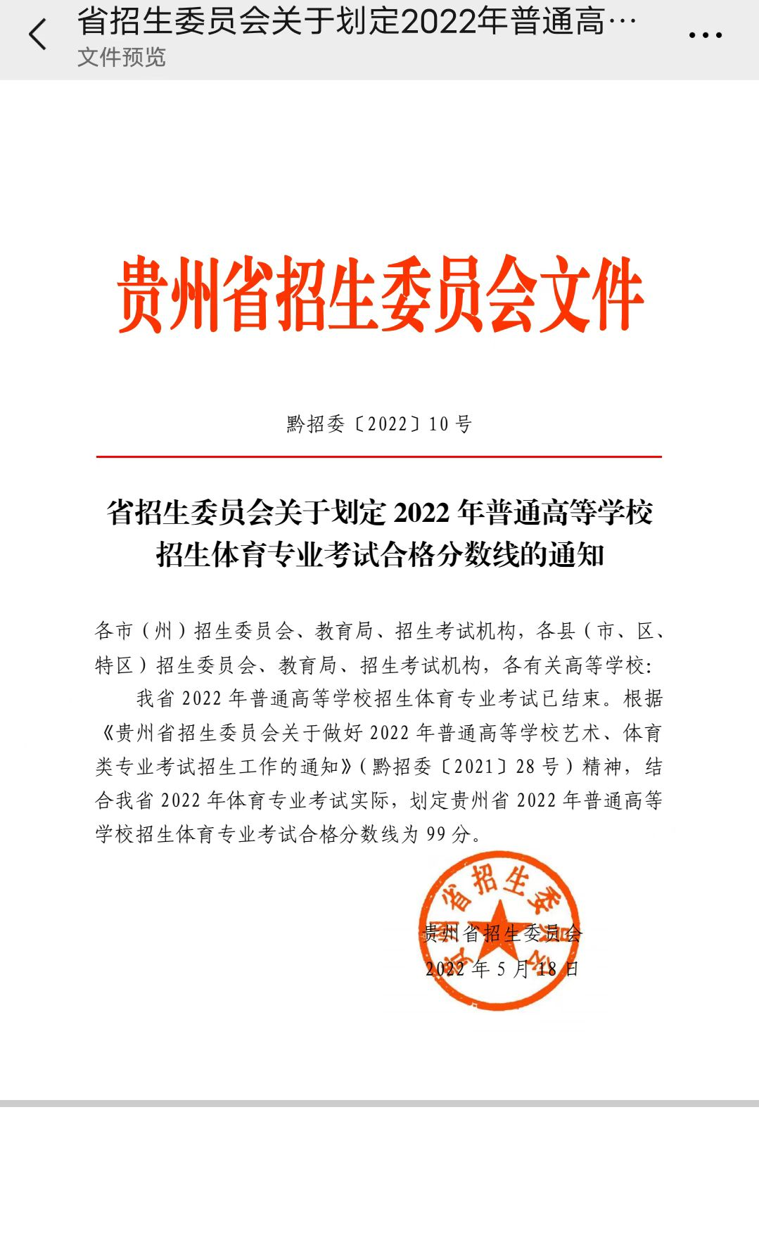 贵州省招生委员会发布体育专业考试合格分数线