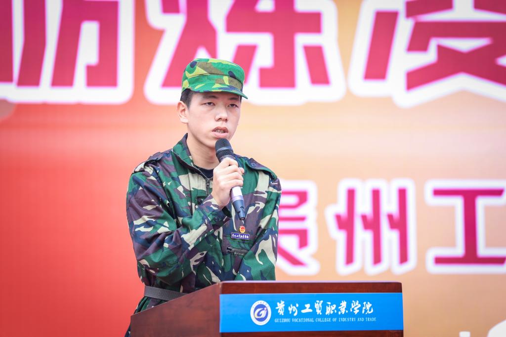 艺术学院2023级室内设计3班的蔡焱代表老生发言,她在发言中勉励2024级的学弟学妹:军训是大学生活中的挑战,是一次珍贵的成长机会。不仅仅是锻炼身体的机会,更是在困难和压力面前锻炼自己的自律性,和坚韧精神的重要阶段。蔡焱作为过来人,她希望2024级的学弟学妹们能以更加昂扬和认真的姿态面对军训的每一个环节,实现自我激励与提升。校领导为新生代表们佩戴校徽。新生胸前承载期许的贵工贸校徽熠熠闪耀,宣示着又一批青春力量在贵工贸走上奋进之路、逐梦之旅。