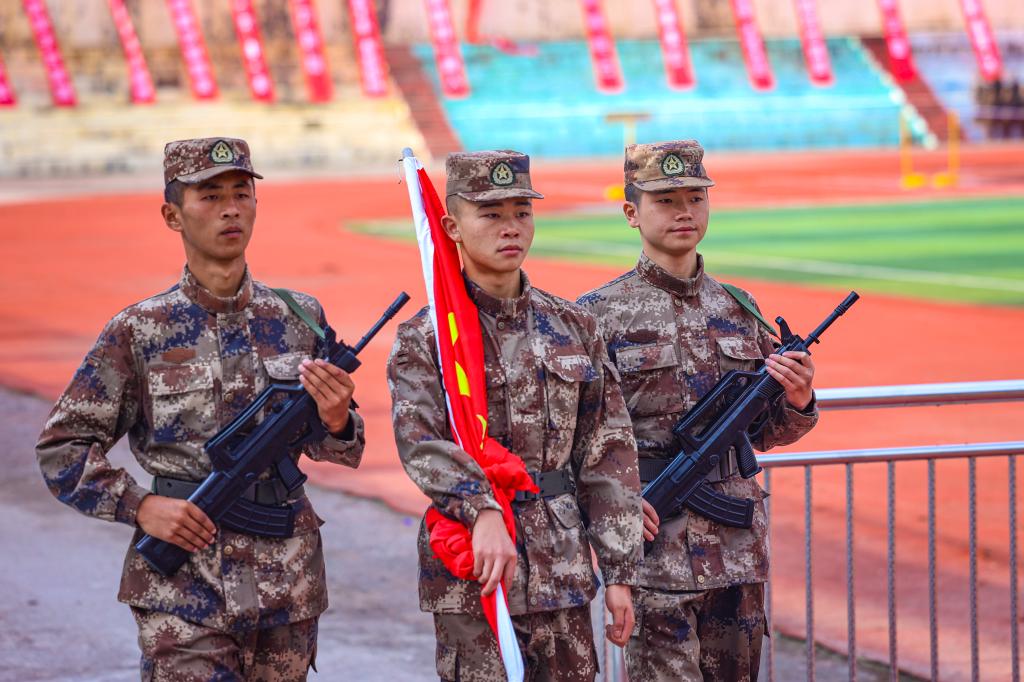 伴随着雄壮的国歌声,国旗冉冉升起,2024级新生开学典礼暨军训动员大会正式开始。