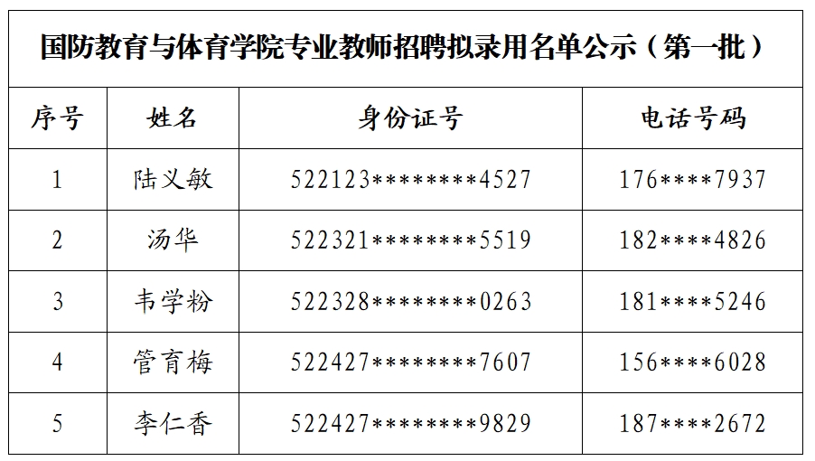 根据《beat365中文官方网站国防教育与体育学院专业教师招聘公告》要求,经简历初筛、面试(试讲)、综合评价,学校研究决定,拟聘用以下同志到我校工作,现予以公示: