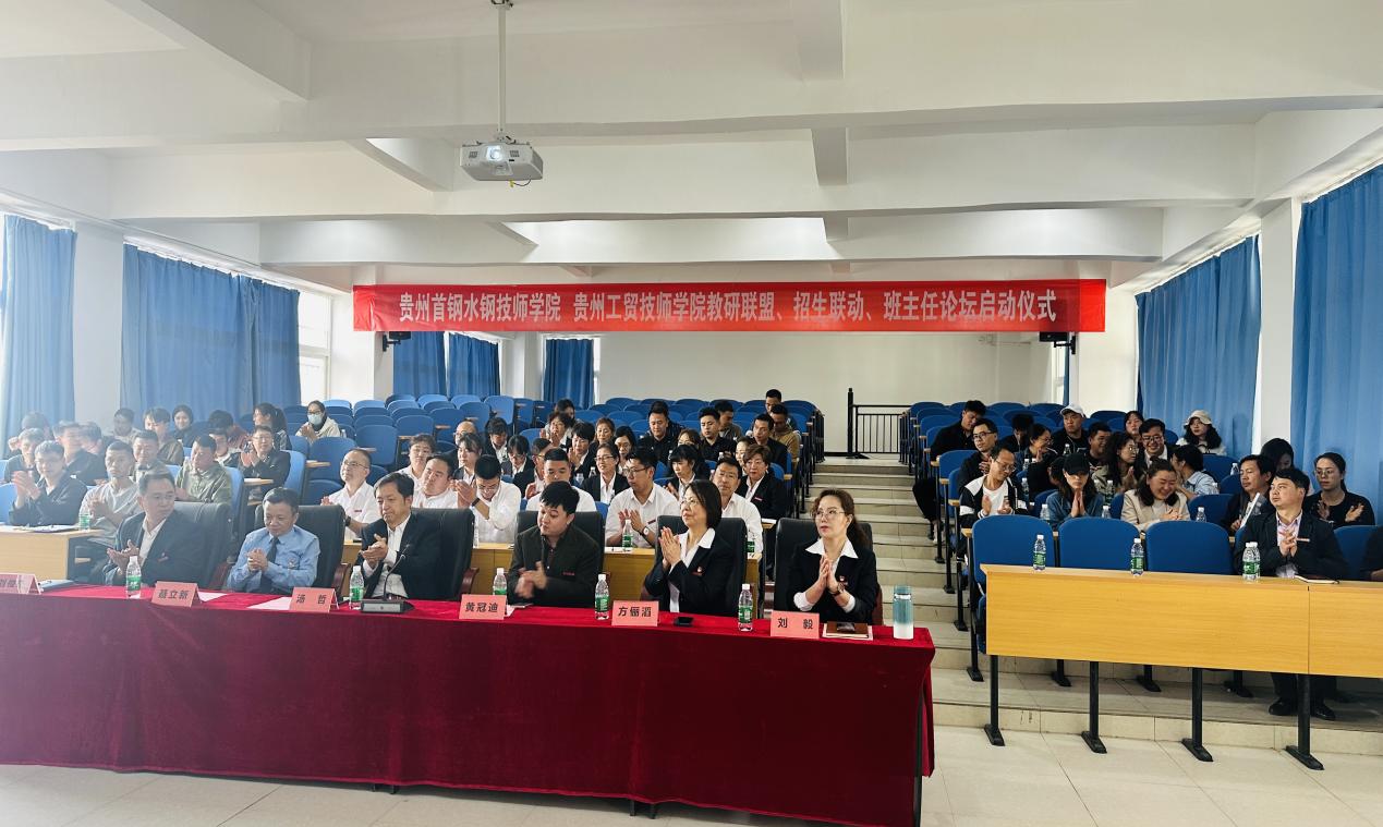 4月19日下午“贵州首钢水钢技师学院、贵州工贸技师学院教研联盟、招生联动、班主任论坛启动仪式”在贵州工贸技师学院明德楼第一阶梯教室举行。贵州省技工教育与职业技能培训协会副会长、贵州首钢水钢技师学院党委书记、院长汤哲;贵州首钢水钢技师学院党委委员、副院长方俪滔;贵州首钢水钢技师学院副院长刘俊杰;贵州工贸技师学院常务副院长黄冠迪;beat365中文官方网站党委副书记、纪委书记聂立新;贵州工贸技师学院执行院长刘毅出席。两校的教务处长、学工处长、办公室主任、招就处长、培训中心主任、各系部主任及招生骨干和工贸技师学院的全体教师参加了此次启动仪式。仪式由贵州工贸技师学院教务处副处长周婧主持。