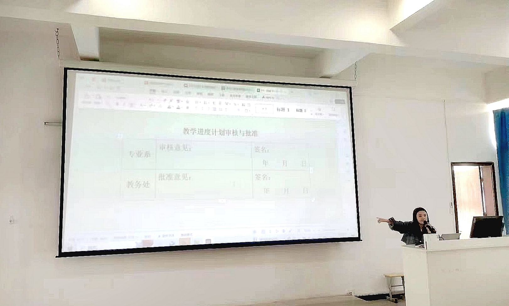 最后,周婧对汪明钟老师和杨盼老师的分享给予了高度评价,并希望全体教师能够向他们学习,将他们的知识和经验内化于心、外化于行。同时,周处长针对教学进度计划进行了深入的再次培训,强调每位老师都需要对计划进行细致的修改和完善。她特别指出,提交截止时间已延长至4月15日下班前,请大家务必按时提交给教务处郭元星老师。我们将严格依照教学管理规定,对未按时提交的老师进行绩效考核。请大家务必认真对待,确保教学进度计划的质量与效率,共同为提升教学质量而努力。她说:“作为教师,我们不能仅仅停留在浅层的理实一体化教学上,而是要突破自我局限,主动学习实践,拓宽知识和视野,为学生的成长和学院的发展贡献一份力量。”