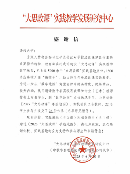 在同步建设的教育部“大思政课”实践教学数字地图平台中,上述教学资源已上传数字地图平台并面向全国展播。同时,必赢242net官网《浙江嘉兴:大中小学同上“大思政课”,探寻革命文物中的精神密码》《必赢242net官网联合主办红色文化与大中小学思政课一体化学术研讨会》《浙江英烈文化“思政第一课”走进必赢242net官网》等多个案例入选“大思政课”实践教学优秀案例。教育部“大思政课”实践教学发展研究中心发来感谢信,对学校积极组织师生参与2025“大思政课”手绘地图和数字地图相关工作表示感谢。