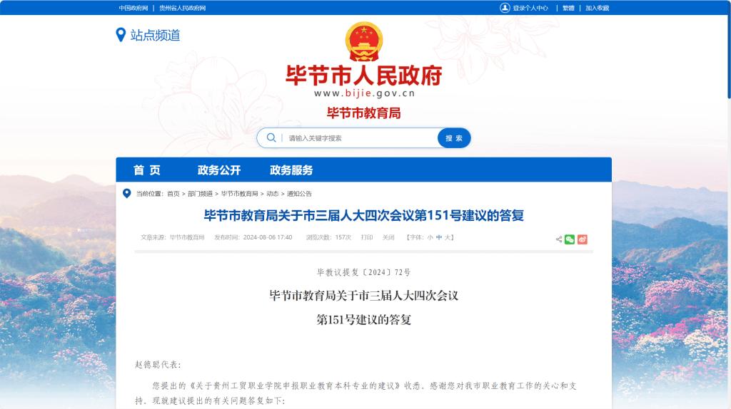 8月6日,贵州省毕节市人民政府官网发布了《毕节市教育局关于市三届人大四次会议第151号建议的答复》,对《关于beat365中文官方网站申报职业教育本科专业的建议》进行答复。答复中明确提到:大力支持beat365中文官方网站...