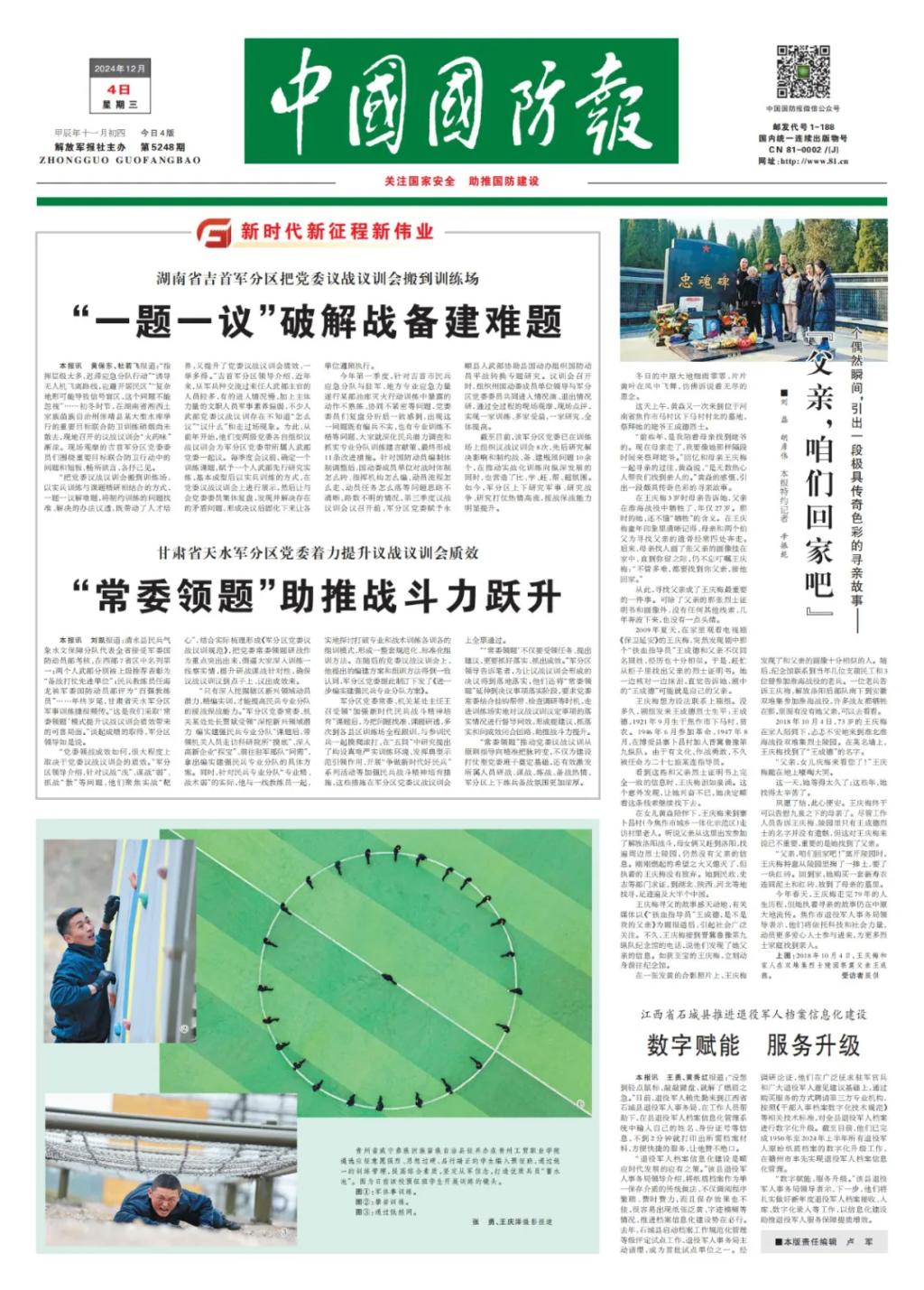 12月4日,《中国国防报》头版报道beat365中文官方网站高原预征班。报道指出:贵州省威宁彝族回族苗族自治县征兵办在beat365中文官方网站遴选应征意愿强烈、思想过硬、品行端正的学生编入预征班,通过统一的训练管理,提...