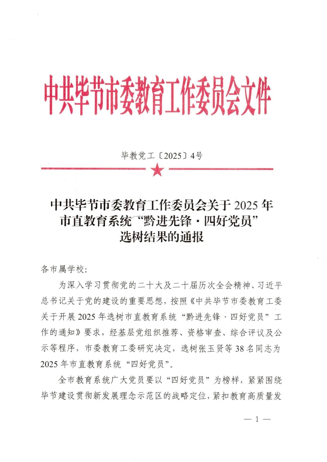 近日,中共毕节市委教育工委关于2025年市直教育系统“黔进先锋·四好党员”选树结果通报的文件中,beat365中文官方网站张功杰、朱丽娟、马学刚3名教师荣获“黔进先锋·四好党员”荣誉称号。
